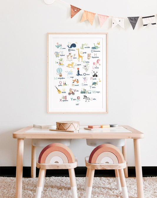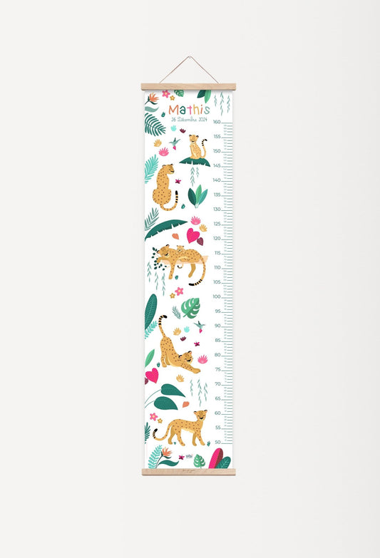 Affiches, cartes étapes et toises de croissance sur le thème de la Jungle : animaux et feuillages pour une ambiance douce et chaleureuse.